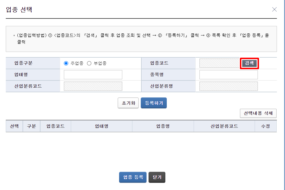 4. 버튼을 클릭하여 들어온 뒤 업종코드란 옆에 검색을 클릭합니다.