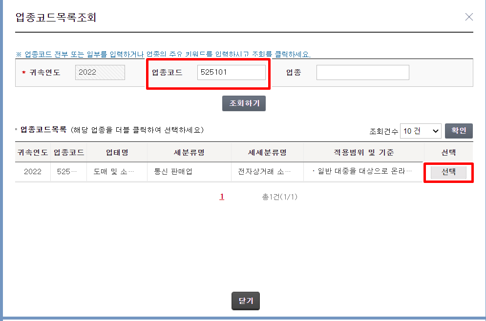 5. 업종란에 본인이 사업자 등록을 하고 싶은 분야에 대해서 검색한 뒤 하단에 선택 버튼을 클릭하면 됩니다.