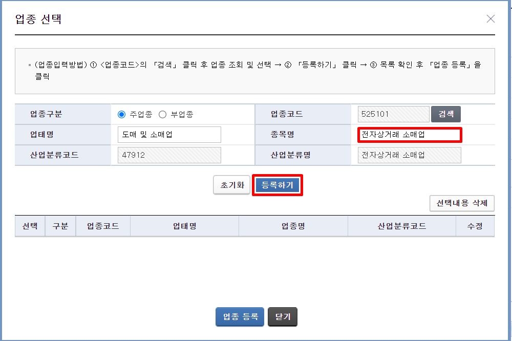 6. 입력한 업태명과 종목명이 맞는지 다시 한 번 확인하고 맞다면 하단에 등록하기 버튼을 클릭하여 업종 선택을 마무리합니다.