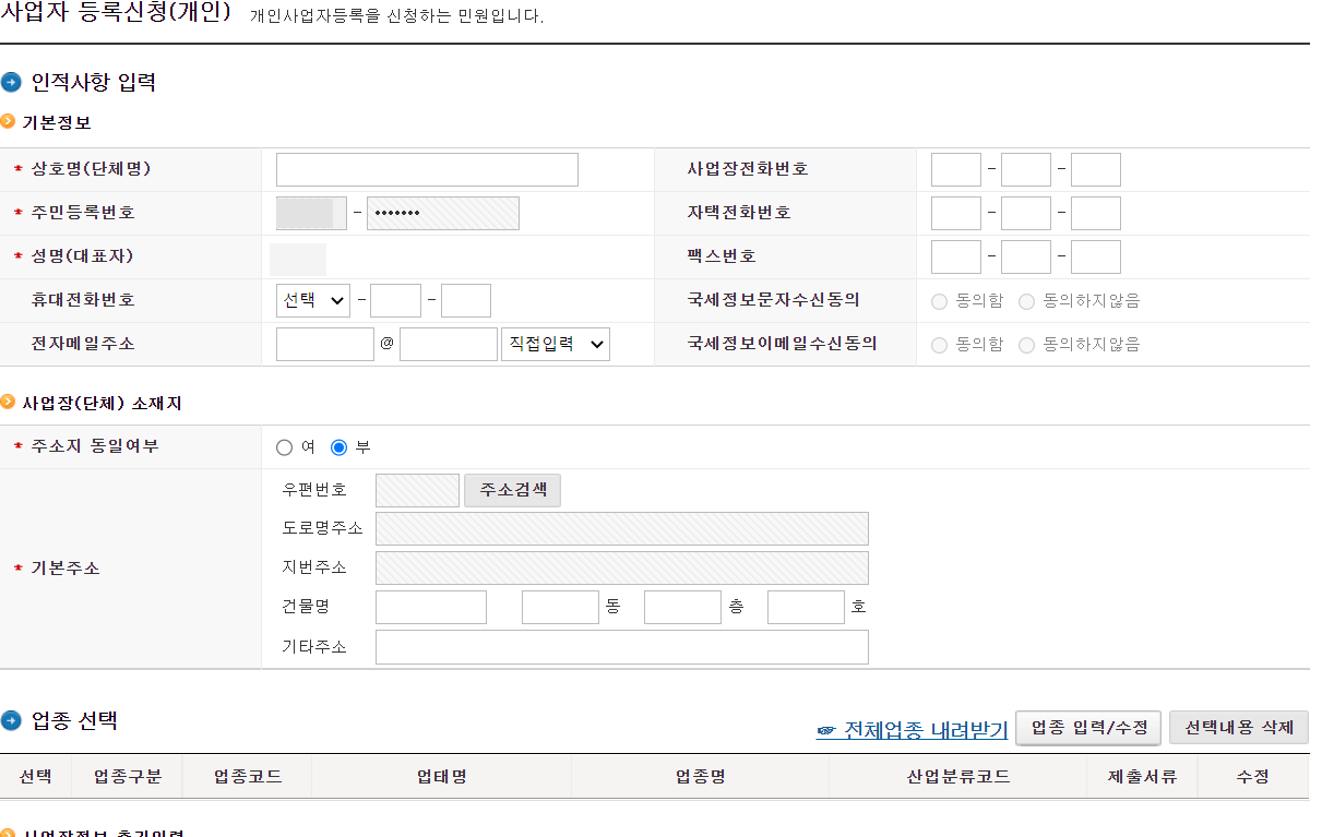 2. 사업자등록신청(개인) 버튼을 누르시면 개인 인적사항에 대해서 입력하는 창이 나타납니다.